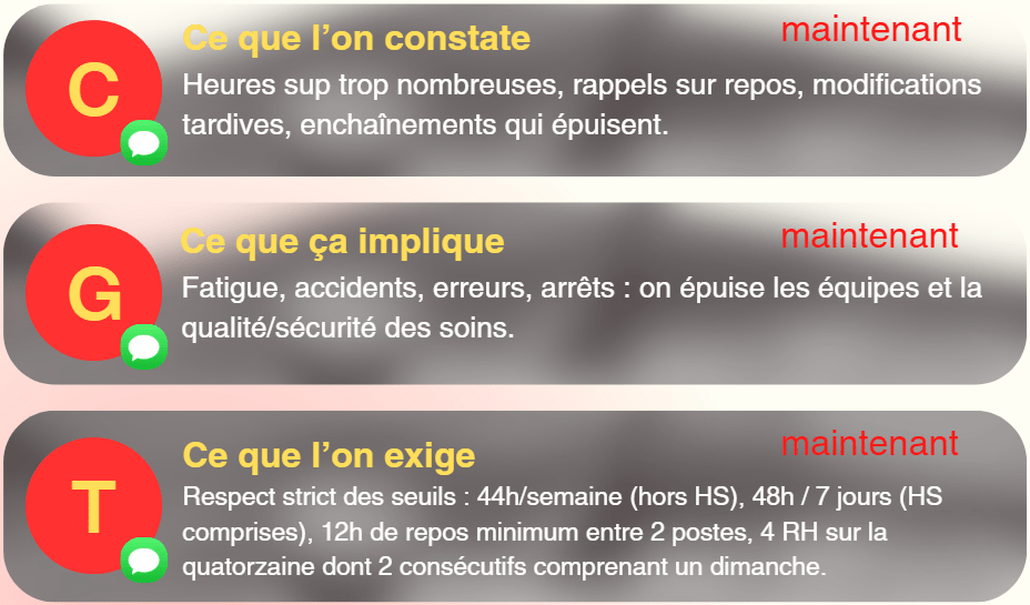 - ☐ Ai-je 12h de repos avant la prochaine prise de poste ?